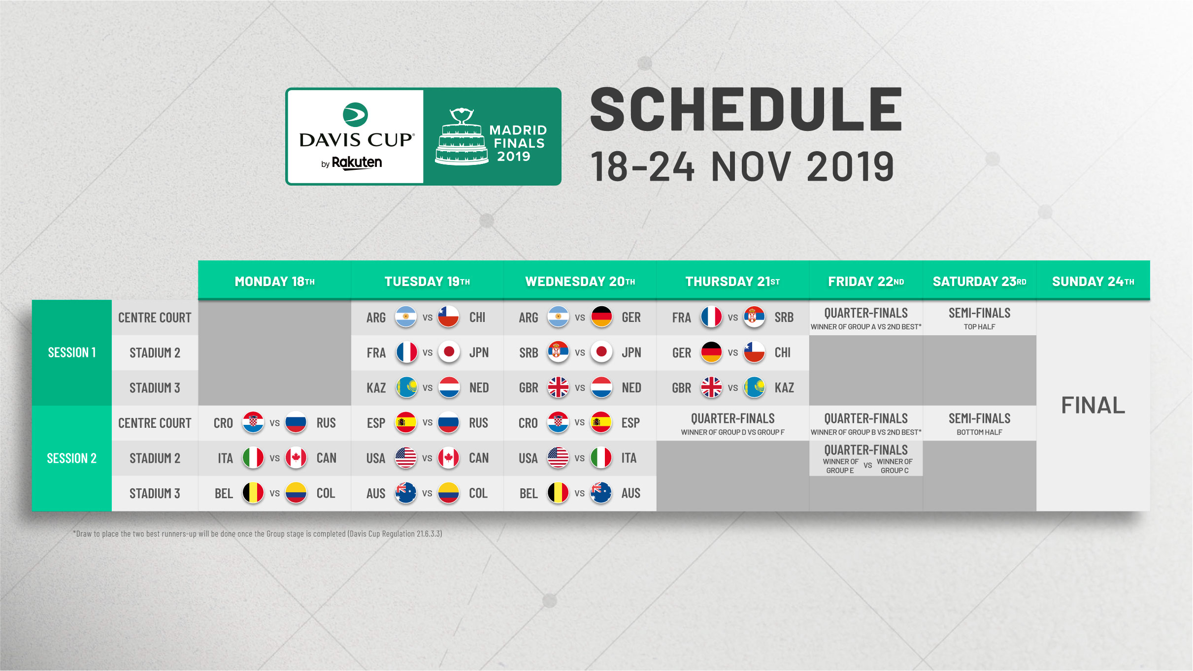 After the first stages (France, Croatia, Spain and the USA, as this year’s Davis Cup semifinalists plus Argentina and Great Britain who were awarded wild cards and directly qualified for the finals), the 18 teams are divided into six groups of three teams to play the finals in November.